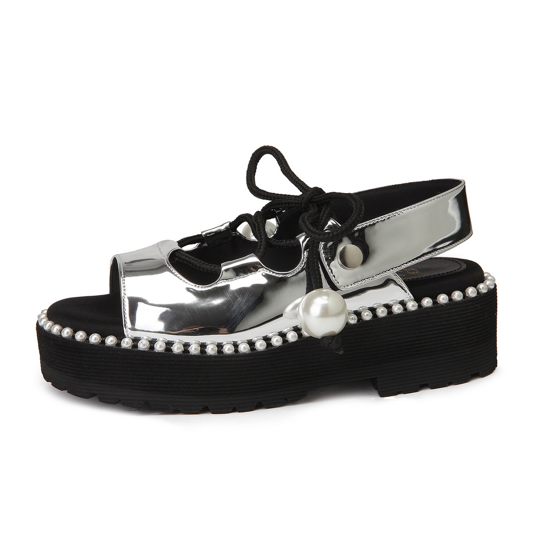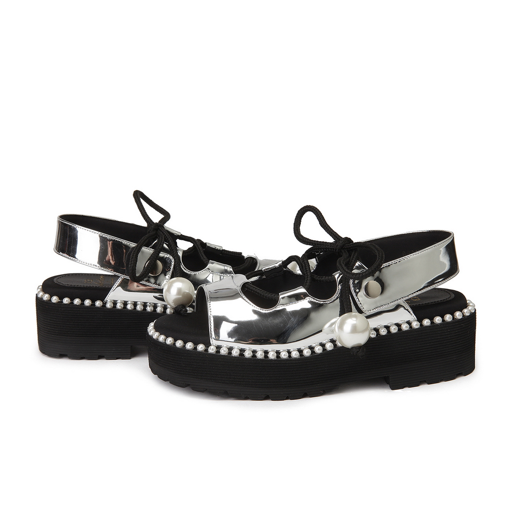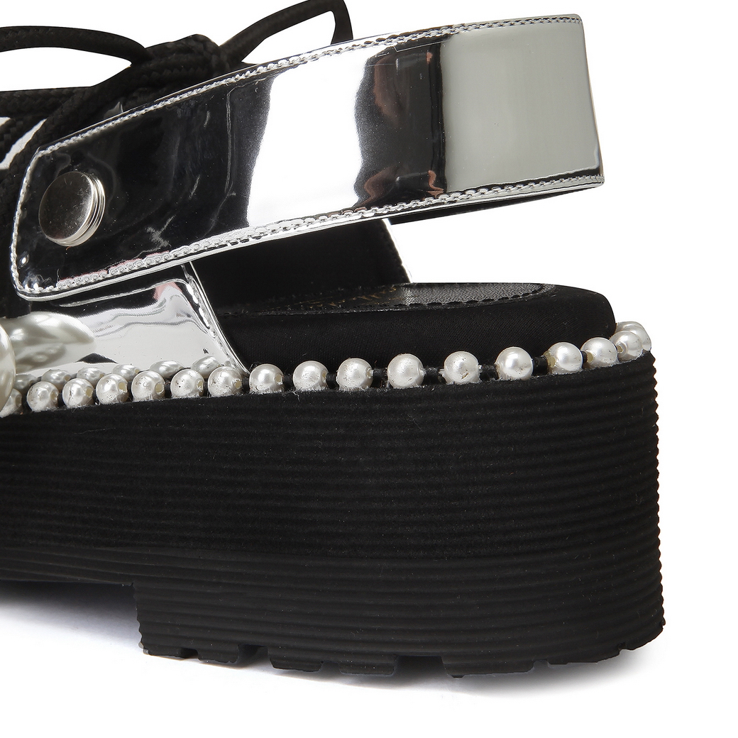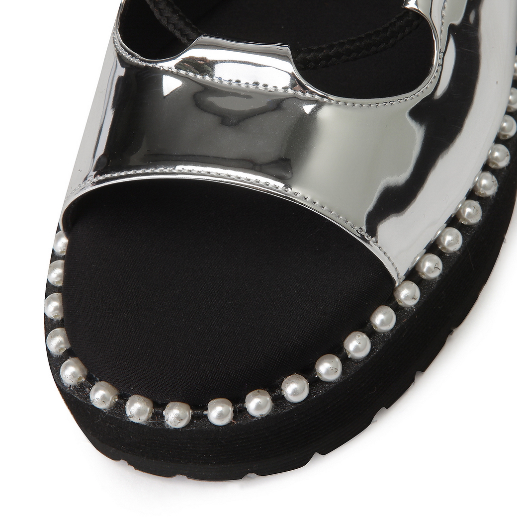 - 볼드한 진주 스트랩으로 포인트를 준 샌들.- 유연한 터치감의 가죽 소재로 착화감이 우수.- 뒷면의 스냅 버튼 스트랩을 탈착이 가능해 뮬로 연출이 가능함.- 대다리 사이드 진주로 여성스러운 포인트를 줌.- 캐주얼에서 러블리 룩까지 연출이 가능함.