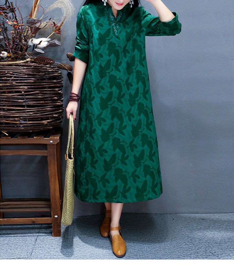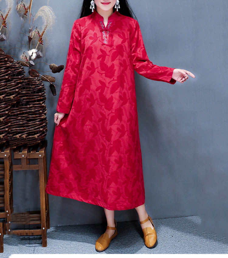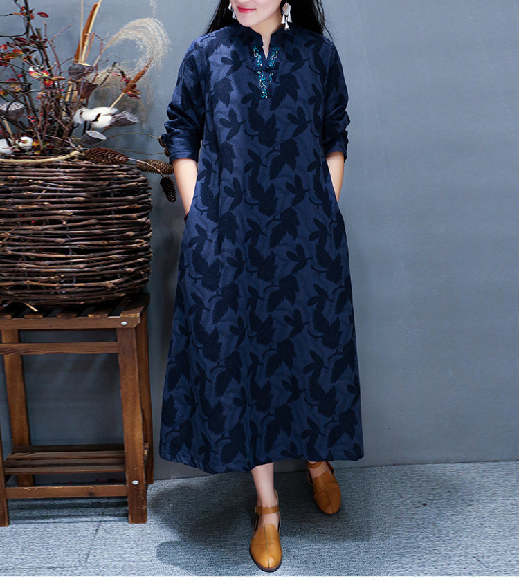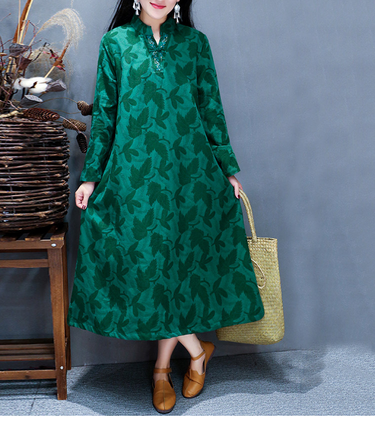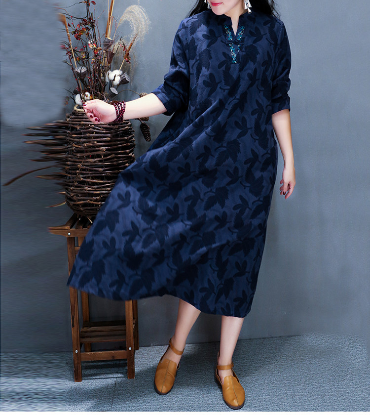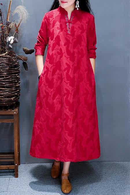 绣花+盘扣中国风提花长款棉麻连衣裙