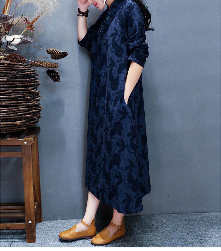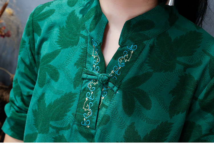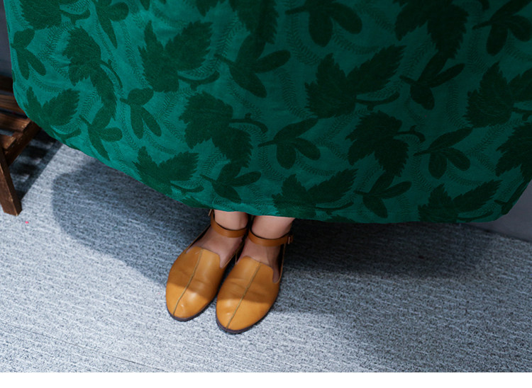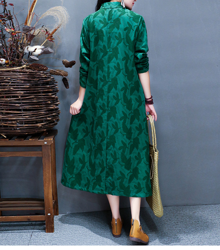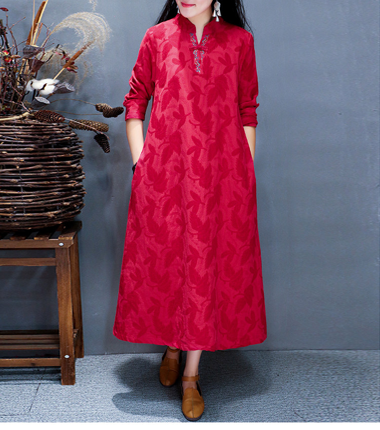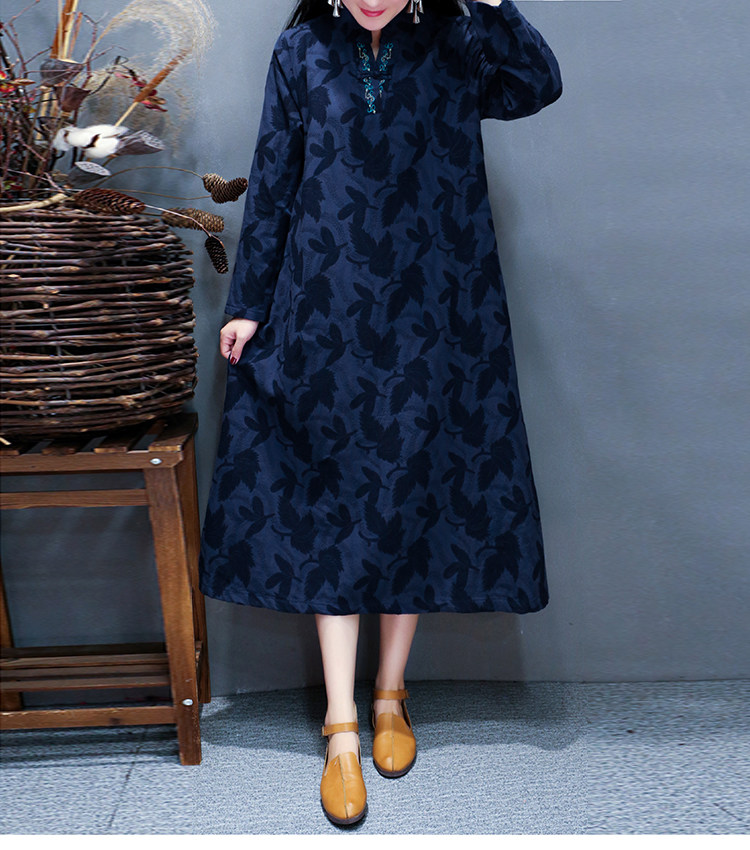 绣花+盘扣中国风提花长款棉麻连衣裙