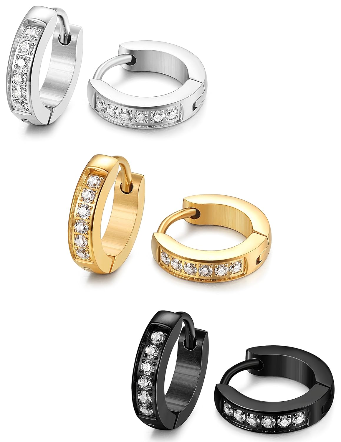 3色1セットのフープピアス、ユニセックスのデザインで、男女兼用できるピアスセットです。丁寧に象眼されておるキュービックジルコニアは煌めきを放ち、高級感とファッション感が溢れてきます。