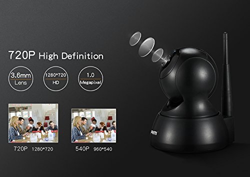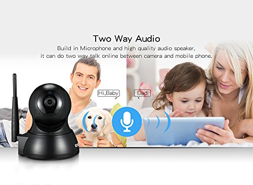 -. Feature : High Video Image Quality: 720P high definition display ,multi-stream design ,adopt to varieties of network transmission speed.Support H.264 video code model. Also, see in the dark with 24 automatic infrared lights. Up to 10m night vision. Build in TF card slot, support MAX 64G TF card. / Motion Detection and Two Way Audio: When motion objects detected, alarm messages, capture and recording, APP push and beep alarm will be triggered and sent automatically. The APP in your mobile platforms will set recording time so that you can clearly see what happened at your home or office. Built-in speaker and microphone provide two way talking and listening so that you can inform or chat with your family or colleague. / Wifi & APP Connection: Without cabling work, it can be easily connected in your phone via Wifi; With wireless access, camera can be connected to phone directly without router. Support APP Connection, 802.11b/g/n wireless connection, RJ45 network cable connection and AP hotspot connection. / Pan/Tilt Monitoring: Adjustable sensitivity, Pan 355 degree and Tilt 40 degree; Sliding screen with two way audio manually enables remote control of the rotation of camera and real time monitoring, support controlling remote pan/tilt by multi-platform like Android/ lOS Mobile Phones Tablets Computers / Easy to set up :Download APP and install,and connect with WiFi Router,then one key to live view to finish, please follow the install instruction attached in the product for more details.