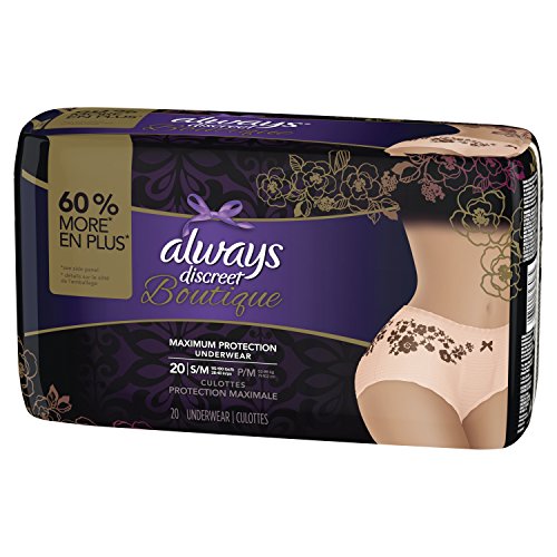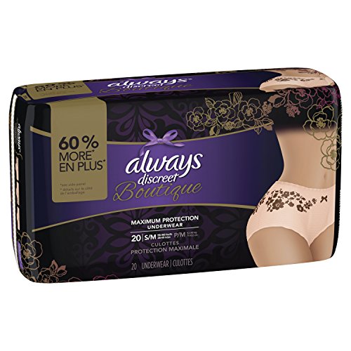 ReleaseDate : 2017-09-25 Studio : Always Publisher : Always Binding : Health and Beauty Product Description Discover the secret to maximum incontinence protection, that's actually pretty, with Always Discreet Boutique Underwear. The secret? Hidden inside is a super absorbent core that turns liquid to gel to absorb even your heaviest leaks. The curve-hugging, feminine design that defines your silhouette is made of silky-soft fabric with delicate, lacy prints, so it looks, fits, and feels like your real underwear. So you can feel protected and pretty, unlike adult diapers. It's maximum protection, you can depend on, made beautiful. 0