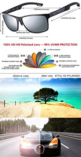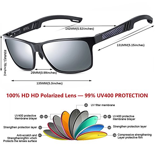 ATTCL provide the most high quality and fashionable,The coolest sunglasses. Please pay attention more ATTCL Brand, You will find more surprises! Brand: ATTCL Lens: 100% UV400 Protection Lens,Blocks 100% Harmful UVA,UVB UVC Rays Frame Material: Aluminum-magnesium Clour: As the picture Size: Lens Height --40MM(1.57 Inches) Lens Width:58MM(2.28 Inches) Temple Length--133MM(5.23 Inches) Nose Bridge:16MM(0.62 Inches) Frame Length 142MM(5.59Inches) Package: Sunglasses *1, Case *1, Glasses Cloth*1, Glasses Bag *1.Polarized test card*1 Service: We Metal Frame provide 30 Day refund and lifetime Warranty on Frame Lens. If you have any problems in the future, Please contact us, We will provide you the best service!