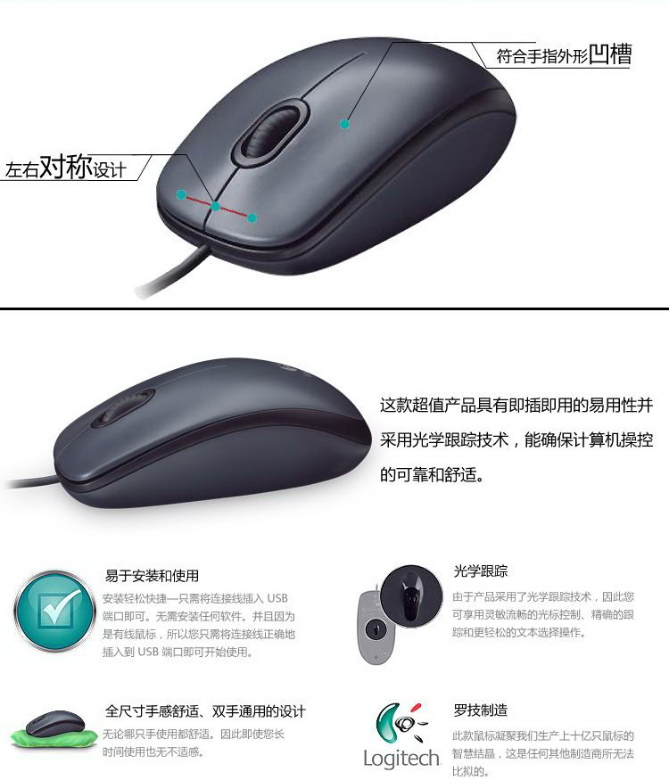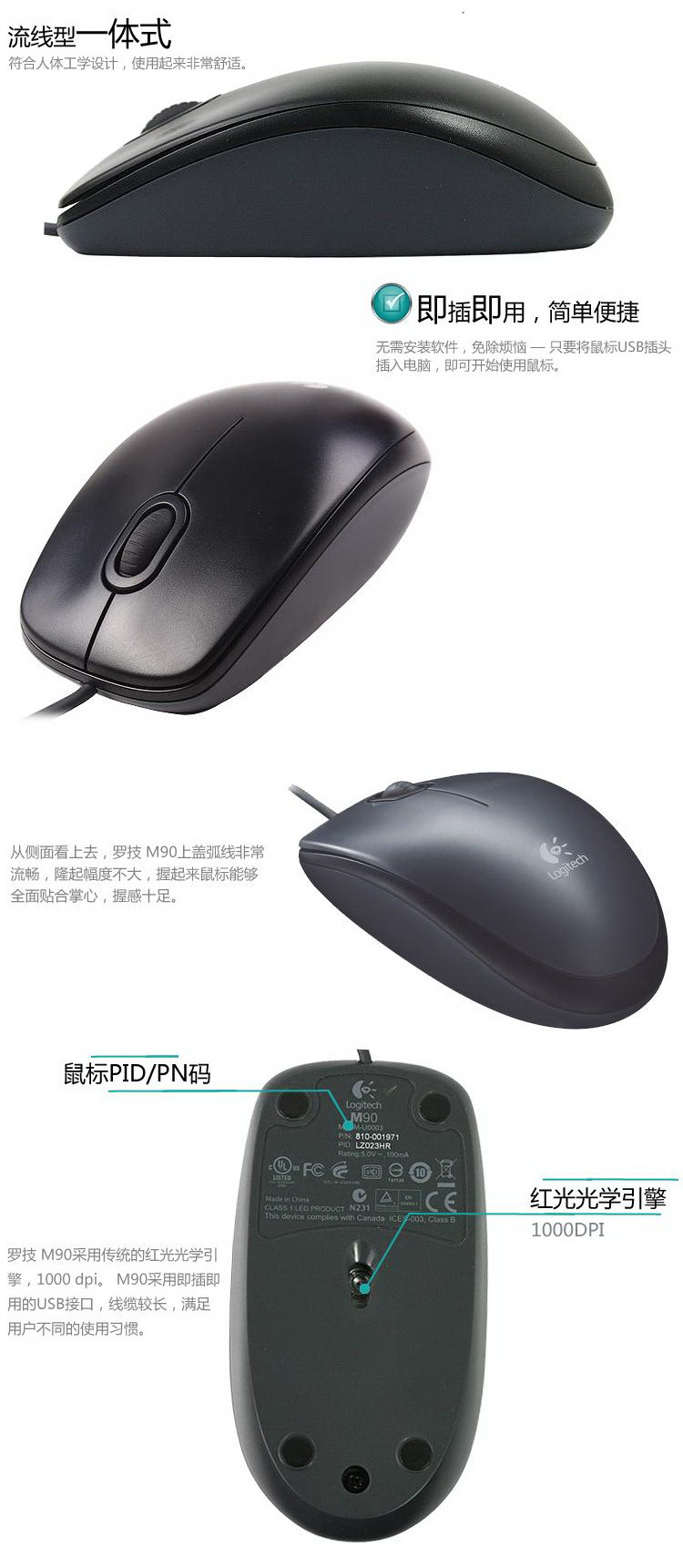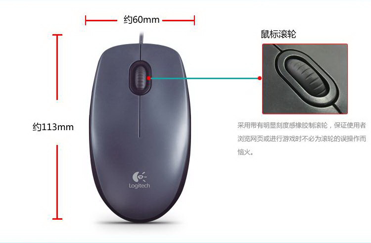 罗技M90鼠标的线材长为1.76米,足以应付普通台式机与笔记本的使用。罗技M90有线鼠标使用了高级的光学引擎,分辨率达到了1000DPI,在日常家用或办公时使用都非常合适。