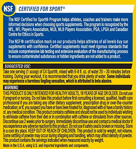 C4 Sport Pre-Workout combines two separate blends to support performance and energy into one, so every base of your workout is covered. When taken 30 minutes prior to exercise and physical activity, C4 Sport will support energy and focus. C4 Sport also contains electrolytes to maintain and replenish intracellular fluid balance.