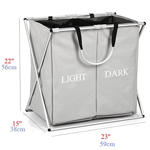 1.Modern styling, 2 Sections, one side for lights, the other side for darks.A mesh drawstring top allows you to secure articles preventing spillage during transport. 2.4 removable fiber glass poles with protective plastic caps for interior support.Easy Assembly. 3.Metal frame and light weight materials make this laundry sorter easy to carry,Folds for easy storage. Assembled dimensions: L23" x W15" x H22" Weight: Approx 710g.<>br> Material: Oxford, Aluminum and Fiber Glass 0