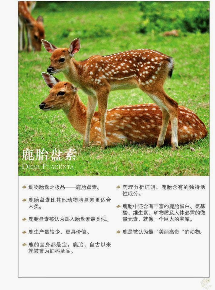 鹿胎盘已被接受为胎盘的主要来源。鹿被认为是"高阶"动物,鹿胎盘非常类似人类胎盘的化学,广泛认同为最上等的胎盘素。它显得格外滋润,是完全可以安全食用。现今胎盘素精华已进展成为人类养生学中最安全有效的滋养品。