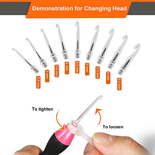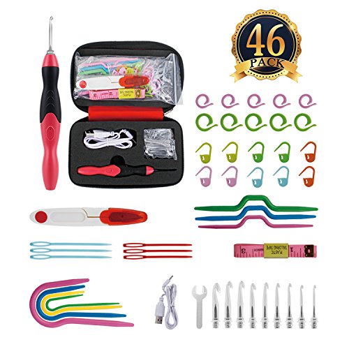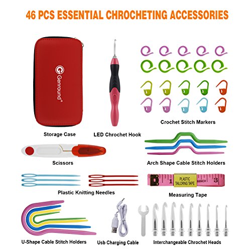 - ◆ COMPLETE SET OF 46PCS. Package includes 1x rechargeable LED chrochet hook, 9x interchangeable chrochet heads(2.5mm, 3mm, 3.5mm, 4mm, 4.5mm, 5mm, 5.5mm, 6mm and 6.5mm), 20x mixed colors crochet stitch markers, 1x mini spanner, 7x Cable Stitch Holders, 6x plastic knitting needles, 1x measuring tape(random color), 1x scissors, and 1x USB charging cable. It basically contains all you need for crocheting and knitting.