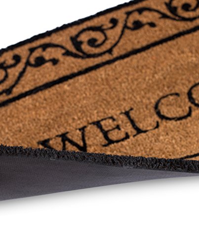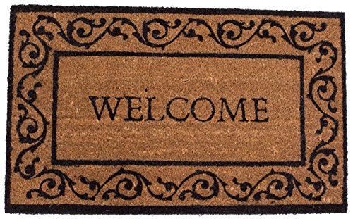 BirdRock Home Welcome Coir Doormat with Scroll Border | 18 x 30 Inch | Standard Welcome Mat with Black Decorative Border | Natural Fade | Vinyl Backed | Outdoor