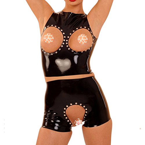 -. Title : EXLATEX Women Latex Rubber Sexy Lingerie Set Cupless Top with Crotchless Brief with Rivets