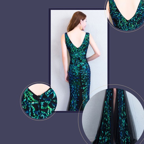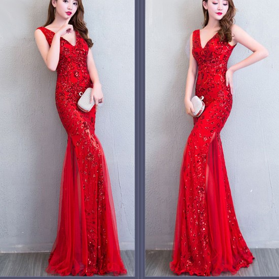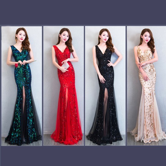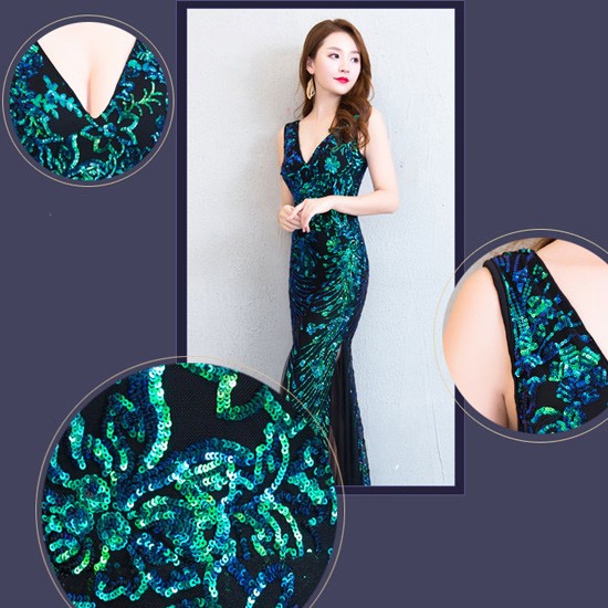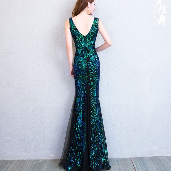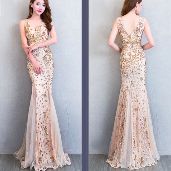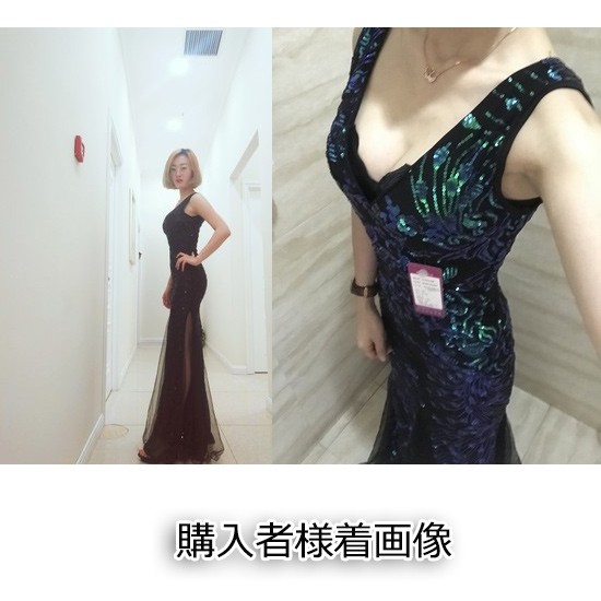 背中のVラインとスパンコールがゴージャスなパーティードレス。
