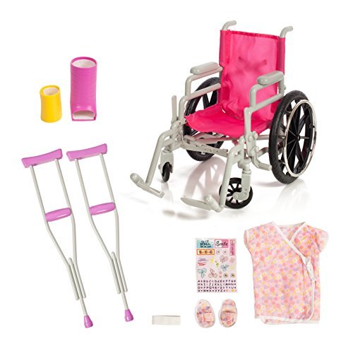 -. Feature : Set includes Pink Wheelchair, Hospital gown with slippers, Crutches, Arm Cast, Leg Cast, Bandage, Get Will Stickers. / Wheel chair and accessories fits for 18 inch dolls, like the American Girl. / No Assembly Required. / The wheels really work. Place your doll in the wheelchair and wheel her around. / Made of top quality & safety tested.