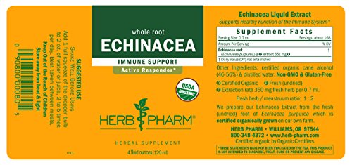 ReleaseDate : 2013-08-16 Studio : Herb Pharm Publisher : Herb Pharm Binding : Health and Beauty Product Description Herb Pharm Certified Organic Echinacea extract works with the body’s natural mechanisms to support the immune system*. Echinacea extract is prepared from fresh (never dried) roots of Echinacea purpurea which are Certified Organically Grown on Herb Pharm’s own farm. To assure optimal extraction of Echinacea's bioactive compounds, the roots are hand-harvested and promptly extracted while still fresh and succulent. Echinacea is easily dosed and taken in liquid form. It may be added to water or other liquid for taste and is easily absorbed into the bloodstream. Echinacea has a deep, earthy taste followed by a tingling mouthfeel. Herb Pharm never uses synthetic solvents. The company farm is Certified Organic, Bee Friendly, and Salmon Safe. Herb Pharm is the #1 selling liquid herbal extract brand in US Natural Food (SPINS). Herb Pharm is a company of herbalists, scientists, and farmers in GMO-free Josephine County, OR. It’s where they have been cultivating herbs with care, precision, and respect for nature since 1979. * This statement has not been evaluated by the FDA. This product is not intended to diagnose, treat, cure, or prevent any disease. 0