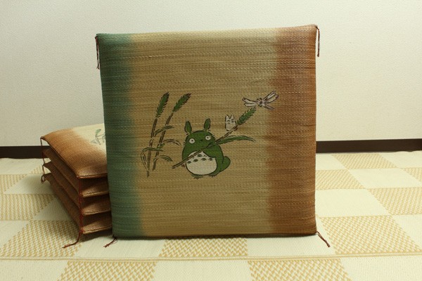 となりのトトロをあしらったイ草座布団です。職人が1枚1枚手作業で捺染プリントを施しました。メセキ織という技法で柔らかい肌感触に仕上げました。またイ草の生地を縫製した後に、生地を湿らせ、裏返しにする『返し』という技法で仕上げております。イ草を通常曲げてはいけない方向に曲げますので、良い(太く強い)イ草でなければ作ることができません。返すことにより、ふっくらしたボリューム感を出しました。国産(九州産)のい草を使用しています。一本一本が太く、表皮が厚く繊維がキメ細かいので弾力性があり、耐久性に優れています。い草には空気の自然浄化作用、湿度の調節作用などがあります。また汚れにくく、使用するうちに黄金色に変化し味が出ます。い草に青森ヒバ加工を施しています(抗菌、防臭効果)。中材はウレタンをフェルトでサンドした三層構造で、適度なクッション性があります。※柄のプリントは職人が手作業で描く為、同じ色・柄であっても多少風合いが異なります。