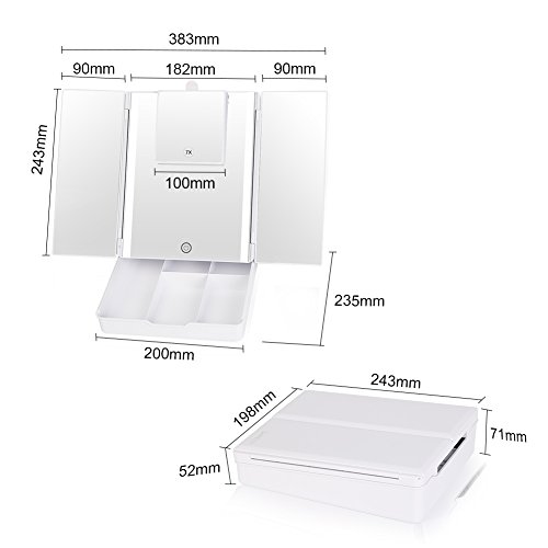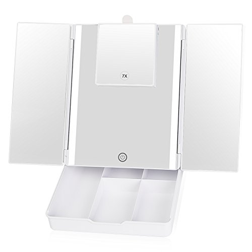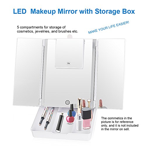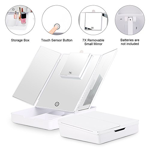 Storage box, Tri-fold Portable Lighted Vanity Makeup Mirror With 7X magnifying, 24 LEDs two strip daylight with touch sensor cosmetic mirror, two power...