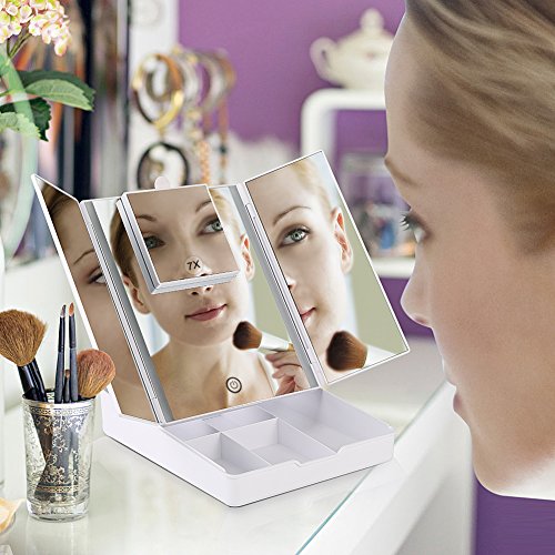 - Offering you soft, natural daylight and insert a removable 7x magnifying mirror, the magnification mirror will allow you to have a crystal clear view of what you do, helping you achieve a flawless, professional result.3 panels high definition true view mirrors provided with wide angle viewing.It's an awesome gift for ladies and girls in Halloween, Christmas, NewYear, Valetine's Day, Mother's Day, Birthday, Party, Performance, Special occasions, etc