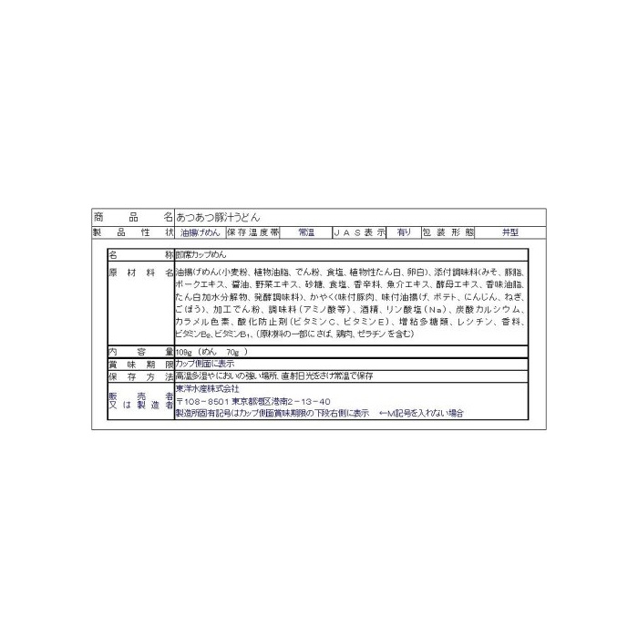 원재료:유부 면(소맥분,식물성 기름지,나오지 않겠 분,식염,식물성 단백,건조 효모,계란 흰자)고, 첨부 조미료(된장,돈기름,포크 엑기스,간장,야채 엑기스,설탕,식염,향신료,생선 및 조개류 엑기스,효모 엑기스,향기 맛 유지,단백 가수분해물,발효 조미료)고, 인지(든가) 질투하다(맛을 낸 돼지고기,맛을 낸 유부,포테이토,(당근)인삼,파,# 것이다)고, 가공 나오지 않겠 분,조미료(아미노산등)고, 주정,인산염(Na)고, 탄산 칼슘,카라멜 색소,산화 방지제(비타민C,비타민E)고, 레시틴,증점다당류,향료,비타민B2,비타민B1,(원재료의 일부에 참깨,하면,닭고기,젤라틴을 포함한다)