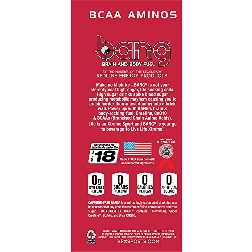 Studio : VPX (Vital Pharmaceuticals) Publisher : VPX (Vital Pharmaceuticals) Binding : Health and Beauty Product Description BANG Black Cherry Vanilla Brain and Body Fuel Caffeine-Free 0g Total Carbs 0 Calories 0 Sugars 0 Artificial Colors Make no Mistake - BANG is not your stereotypical high sugar, life-sucking soda masquerading as an energy drink! High sugar drinks spike blood sugar producing metabolic mayhem causing you to crash harder than a test dummy into a brick wall. Power up with BANG's potent brain body-rocking fuel: Creatine, CoQ10 BCAAs (Branched Chain Amino Acids). Life is an Xtreme Sport, and BANG is the Xtreme source to Live Life Xtreme! 0