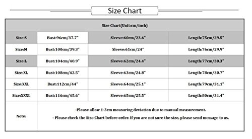 ♥ Size:XXXL Bust:116cm/45.6" Sleeve:65cm/25.5" Length:80cm/31.4" CARE INSTRUCTION: Both hand and machine wash, bleach is forbidden, low iron if necessary ★★ Delivery Time: ★★ The estimated delivery time will be 10-25 business days by Standard delivery and 3-5 days by expedited delivery, please ignore the Amazon delivery time. ★★Service: ★★ We promise that we will try to our best to solve your issues and make sure you will have a nice shopping experience! ★★ Return Policy: ★★ Free exchange for wrong item shipped or item damaged. For DO NOT LIKE STYLE/COLOR reason or size problem, customer's responsibility to return the items to our facility in US. 0