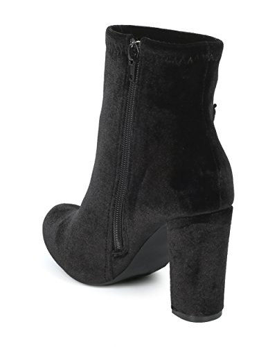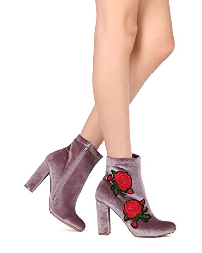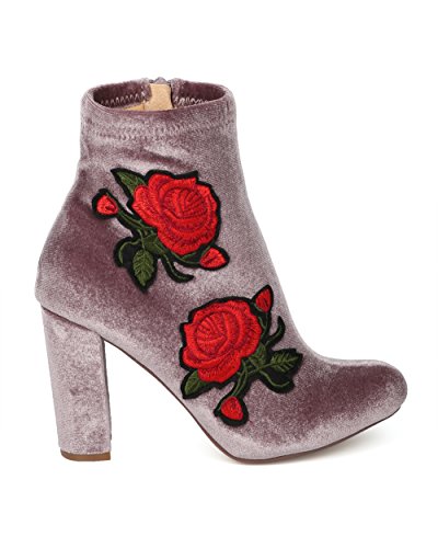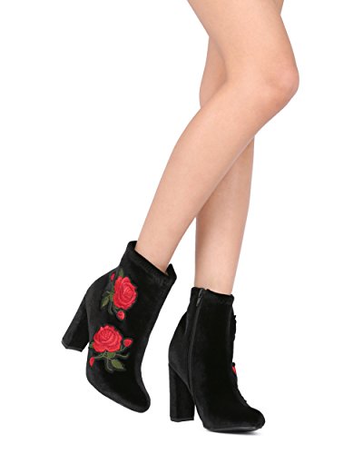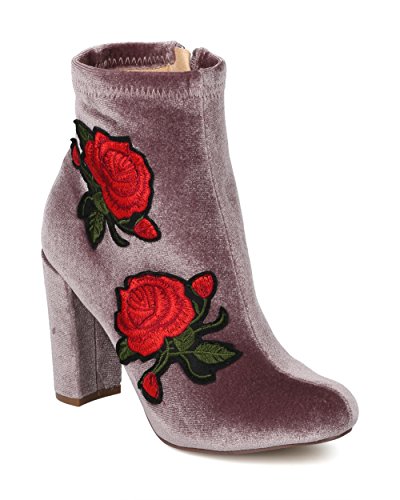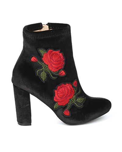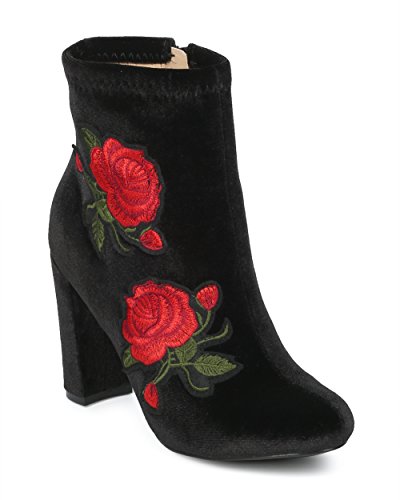 (Alrisco)/Women's/Boots/DIRECT FROM USA/Women Velvet Embroidered Rose Patch Chunky Heel Bootie - HG16 by Liliana Collection