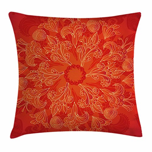 Red Mandala Throw Pillow Cushion Cover by Ambesonne, Vibrant Colored Doodle Style Nature Figure...