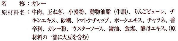 | 原材料 | 名称:カレー 牛肉、玉ねぎ、小麦粉、動物油脂(牛脂)、りんごピューレ、チキンエキス、砂糖、トマトケチャップ、ポークエキス、チャツネ、香辛料、カレー粉、ウスターソース、醤油、食塩、酵母エキス、(原材料の一部に大豆を含む) |