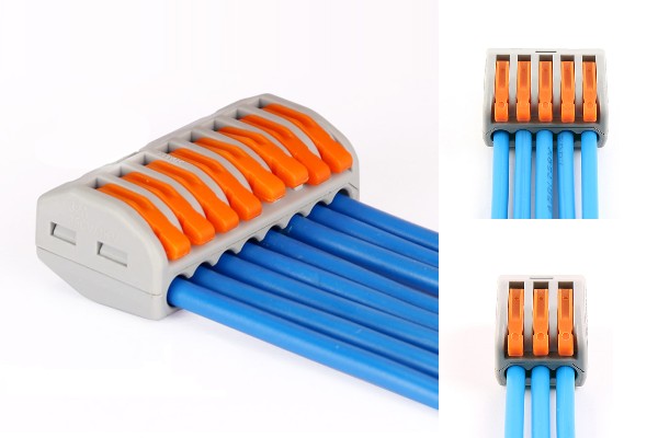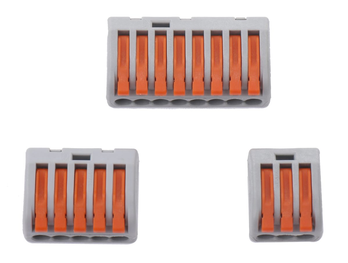 ・配線の付け外しが工具無しで簡単に出来ます。 それぞれ8本、5本、3本の接続タイプで分岐部分がすっきり。 配線の先端を1mm程剥くだけで半田などを使わずに確実に接続します。絶縁テープも不要です。