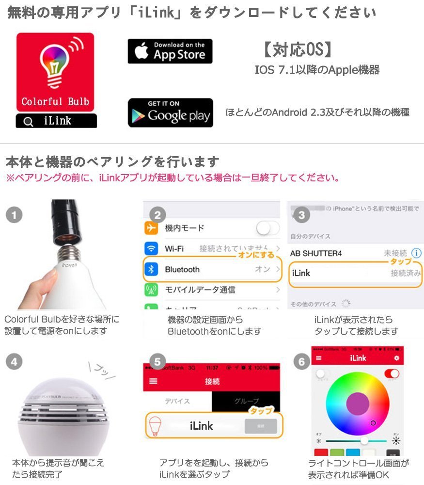 The bluetooth setting screen of the smartphone indicates that iLink connected iLink APP has been connected.