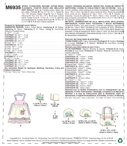 -. Title : McCall Pattern Company M6935 Apron Potholders Napkins Napkin Rings Placemats Toaster Cover and Insulated Soft Cooler, One Size