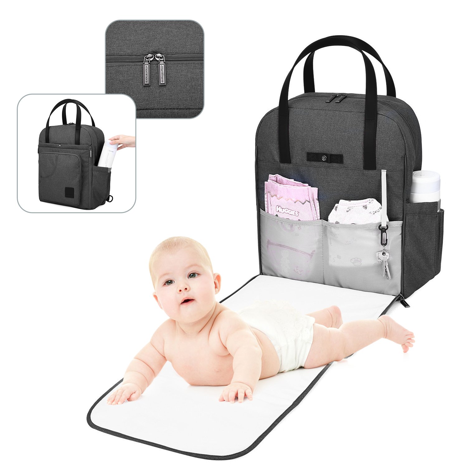 4pcs front pocket (with key holder): Baby clothes, diapers and accessories can be stored.