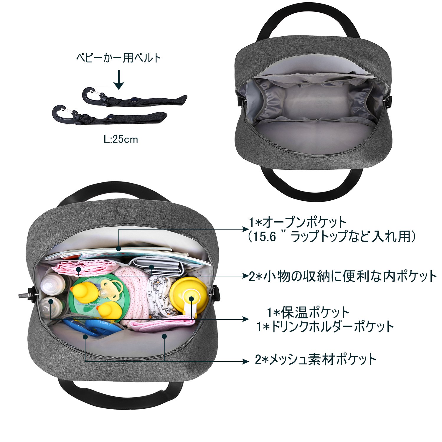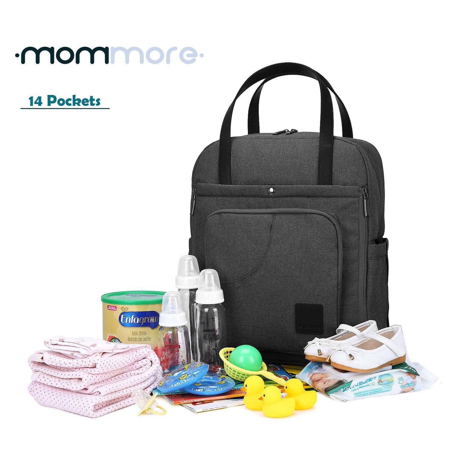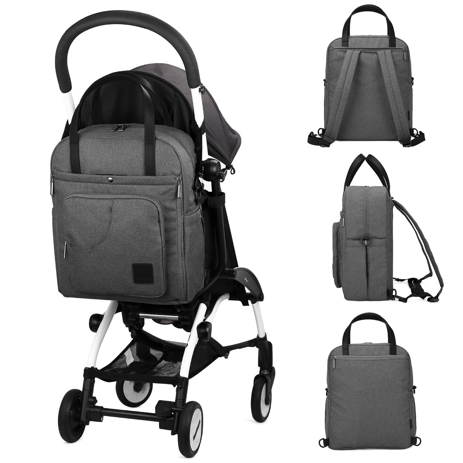 Main pocket (4pcs open pocket, 1pcs thermal insulation pocket): It houses children's change clothes, notebooks, food bags, baby bottles, ipad, bath towels, mama makeup pouches, toys, etc. and stores a set of essential supplies for newborn babies