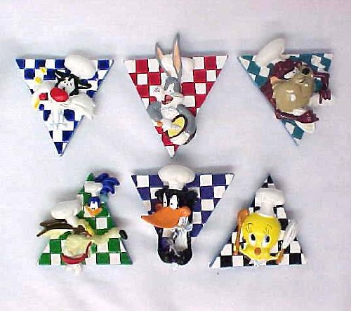 Set of 6 different resin magnets includes Bugs Bunny, Tweety, Taz, Daffy Duck, Sylvester and Coyote & Road Runner. Magnets are 2-1/2 tall.