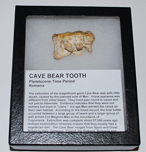 Studio : Fossils, Meteorites, More Publisher : Fossils, Meteorites, More Binding : Toy Product Description This is a tooth from the prehistoric carnivore CAVE BEAR. Included with the fossil is a nice glass-topped display box. The tooth measures approximately 1 3/4 inches in length. The cave bear (Ursus spelaeus) was a species of bear that lived in Europe during the Pleistocene and became extinct at the beginning of the Last Glacial Maximum about 24,000 years ago. 0