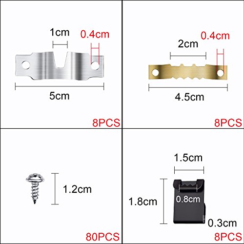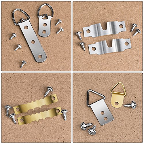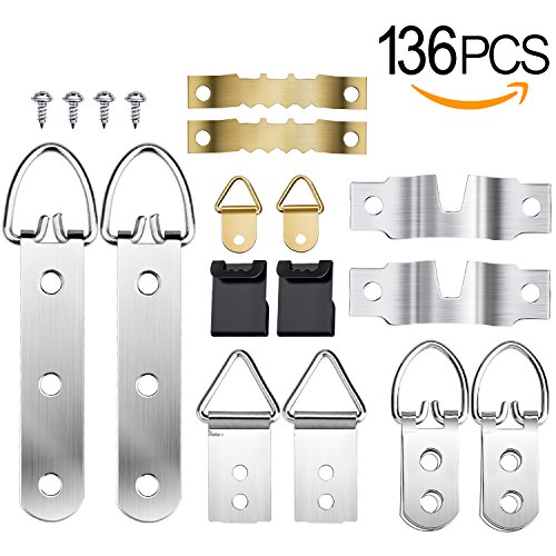 - Value package: 136pcs picture hangers, includes 8pcs x 3 hole d-ring hangers; 8pcs x 2 hole d-ring hangers; 8pcs x 2 holes triangle ring picture hangers; 8pcs x 1 hole holes triangle ring picture hangers; 8pcs x 2 holes sawtooth picture hangers; 8pcs x silver 2 holes hanger hooks; 8pcs x Black S shape frame hanging hooks; 80pcs x screws.