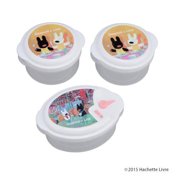 | リサとガスパールのレンジ容器3点セット。冷蔵・冷凍保存も可能で、310mL容器はフタをしたまま電子レンジも使用できます。 |