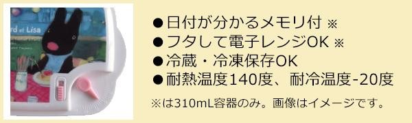 | 仕様 | 日付メモリ、蒸気穴付(310mL容器のみ) 電子レンジ可 冷凍保存可 食洗機・乾燥機不可 耐熱温度140度、耐冷温度-20度 |