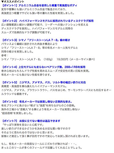 【포인트2】 하이 퍼포먼스 모델에 채용 되고 있는 디스크 드래그 채용.넓은 조정 범위와 세세한 조정이 가능하고,리더에의 강한 텐션을 억제하는 디스크 드래그를 채용하고, 하이 퍼포먼스 모델과 동등이 부드럽고 효과적인 드래그 조정이 가능합니다.【포인트3】시마노「후리스톤LA 78」계급의 가벼움.밸런스 잘 섬세하게 설계 된육 빼기 구조에 의해 시마노「후리스톤LA 78」등의 유명 메이커 인기 모델과 동등의 가벼움을 실현 했습니다. 【포인트4】상위 모델에도 뒤떨어지지 않는 베어링수,2BB+1RB를 채용.감음 기분은 물론 드래그 성능을 높이는 부드럽고 안정성의 높은 회전을 실현.유명 메이커로도 지치지 않은 성능을 자랑합니다.