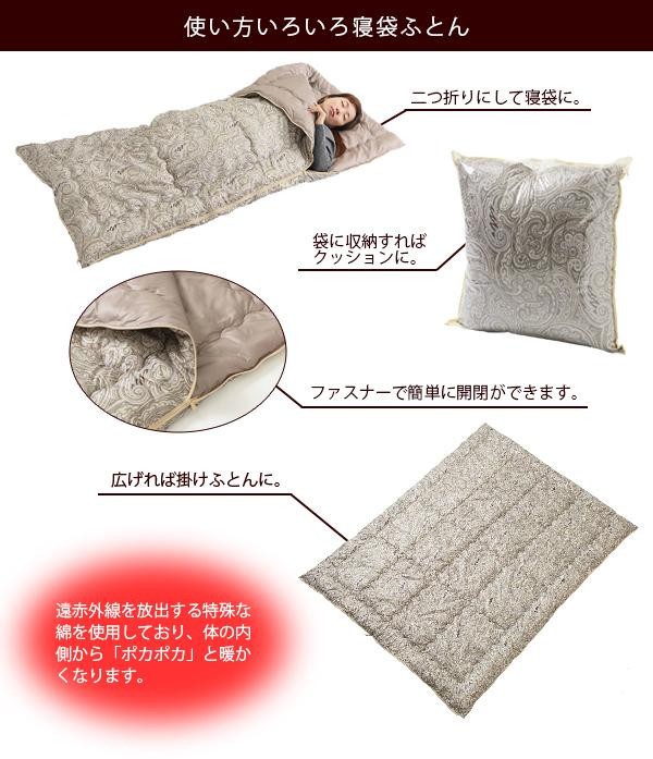 | 素材・材質 | 【寝袋ふとん】 重量:約1240g 側地:ポリエステル100% 詰物:ポリエステル100%(遠赤綿入り) 【クッションカバー】 ポリエステル100パーセント(ファスナー付き) |