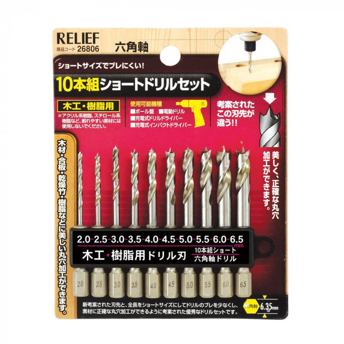 fk094igrjs木材、合板、乾燥竹、樹脂などに美しい丸穴加工ができます サイズ 個装サイズ:13×8×3cm 重量 個装重量:118g 仕様 10本組 木工、樹脂用 六角軸:6.35mm 【使用可能機種】 ボール盤 電動ドリル 充電式インパクトドライバー 充電式ドリルドライバー 製造国 中国 ショートサイズでブレにくいドリルセット ※アクリル系樹脂、スチロール系樹脂など割れやすい素材には使用しないでください 木材、合板、乾燥竹、樹脂などに美しい丸穴加工ができます