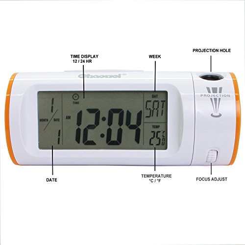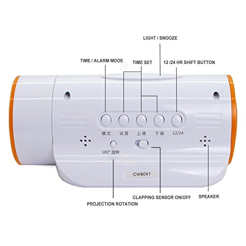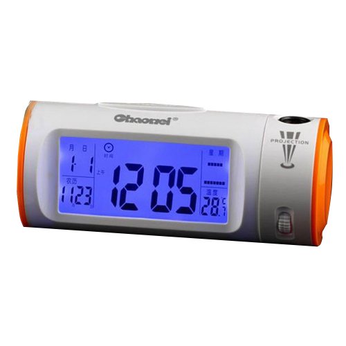 - Feature : projection lens can be rotated to adjust the angle of around 60 degrees range / digital projection sharpness can be adjusted by focusing wheel; / two independently controlled alarm, and a snooze function / LCD Chinese week, the Gregorian calendar, the lunar date, time and temperature; Memory 200 calendar data is automatically updated at any time and at any time. / Battery: 3 AAA batteries(battery not included)