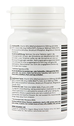 -. Feature : 500 mcg Vitamin B12 + 2mg Vitamin B6 und 368mcg Folsäure, 90 Tabletten / Ideal als Nahrungsergänzung für einen erhöhten Vitaminbedarf, insbesondere für Veganer / Vitamin Komplex B12 - B6 - Folsäure / 500 mcg B12 (20.000% der empf. Tagesdosis) in der biologisch wirksamen Coenzym-Form des Vitamins Methylcobalamin), 2 mg B-6 (143% der empf. Tagesdosis), 368 mcg Folsäure (184% der empf. Tagesdosis) / 100% vegan und frei von: Rindergelantine, Gluten, Milch, Laktose und Gentechnik