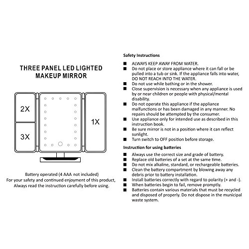 - Package Include: Main Mirror (Black) with 21 pieces bulid-in LED Lights and a small 10X mirror ; Mirror Base; Product Instruction