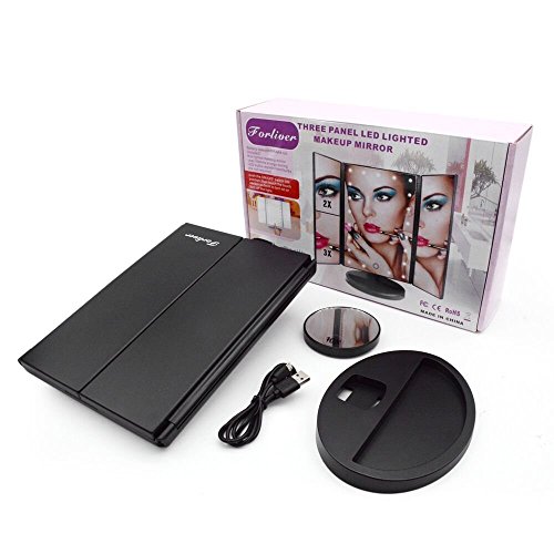 Lighted Makeup Vanity Mirror, Tri-Fold Illuminated Cosmetic Mirror with 3X/2X/1X Magnification, Rechargeable Led Light Tabletop Mirror with USB Cable, 21 Super Bright LED (Black)