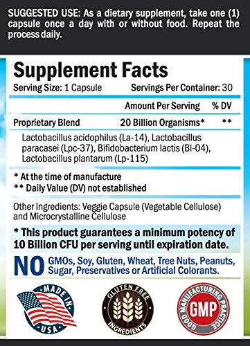 Probiotic 20 Billion CFU. Guaranteed Potency until Expiration. Patented Delay Release, Shelf Stable Probiotic Supplement. Gluten Free Probiotic with...