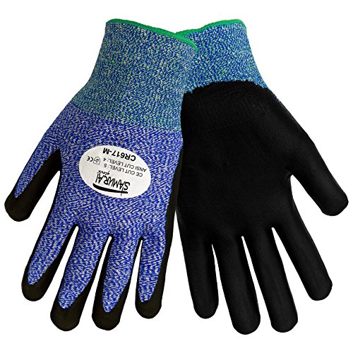 Studio : Global Glove Publisher : Global Glove Binding : Misc. Product Description Global Glove CR617 Samurai enhanced Tuffalene HDPE. Black foam nitrile flat dipped. ASTM 1790 level 4 cut resistance 1960 grams. Level 4 cut resistant hand protection. Foam nitrile coated palm. Outstanding grip qualities. Applications: used wherever material handling of sharp objects such as glass, sheet metal or razor sharp steel. General purpose. Coating color: black. Coating composition: nitrile. Liner: seamless knit (tuffalene brand HDPE yarn). Smooth exterior finish. Cuff finish: elasticized knitwrist. Tuffalene liner provides excellent cut resistance and dexterity. Ergonomically designed forms provide naturally curved, relaxed fit to reduce hand fatigue. Provides good wet and dry grip. Applications: assembly involving small sharp components, automotive, white goods, plastics, glass. Five years in cool, covered conditions. Extended exposure to direct sunlight or excessive heat will reduce shelf life and result in fading, discoloration and cracking. Large size. 0