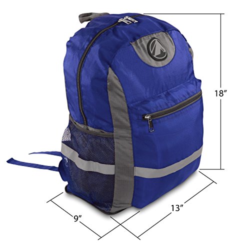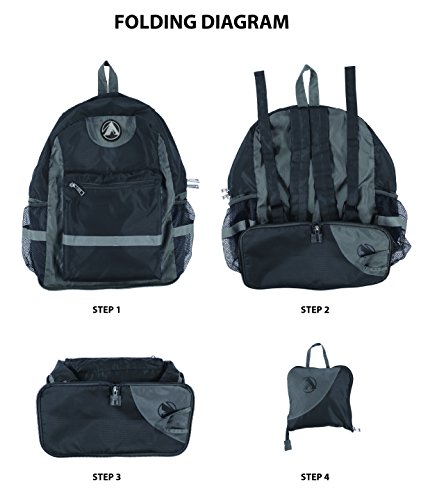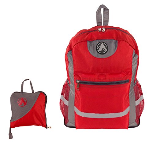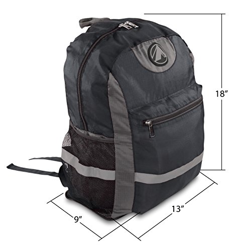 -. Feature : DURABILITY: This GigaTent Stowaway backpack is made with high grade tear resistant nylon and water resistant fabric. / FEATURES: Large main compartment offers generous space for packing gear and equipment and large zippered front pocket great for storing tablets, phones and other smaller essentials.It is also equipped with 2 side mesh pockets, great for storing large drink bottles and sewn-on zippered interior pocket offers additional storage space. and adjustable shoulder straps. / SAFETY: Sewn-on reflective strips for night time safety. / MULTIPURPOSE - Ultra-light. Ultra-durable. Water-resistant. The backpack is perfect for day-to-day use or day trips, vacation, travel, day hikes, school, camping and shopping, and great gift for everyone. / SIZE: Unfold size: 13"W x 18"H x 9"D inches, Folds into: 6" x 6" x 2" inches. Capacity: 34 liters. Weight: .45 lbs.1 Large Main Compartment, 1 Large front pocket, 2 Side mesh pockets Bottle Holder.