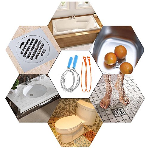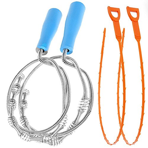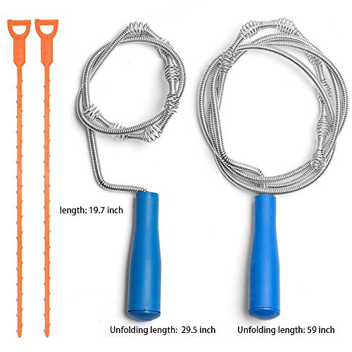 - Length: one mental drain cleaner is 27.6 inch, another mental one is 59.1 inch, two plastic drain cleaners are 19.7 inch. four drain clogs removers remove clogs and debris to make drain pipe flow smoothly.