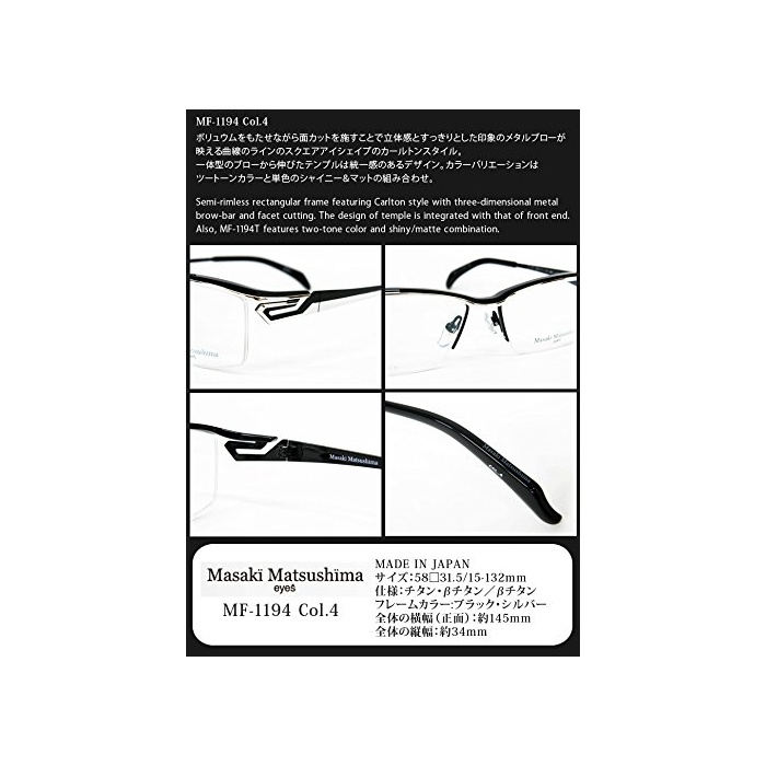 원본상품명: (マサキマツシマ)薄型非球面レンズ付 Masaki Matsushima MF-1194 Col.4(ブラックシルバ)レンズ付メガネセット(度付き)