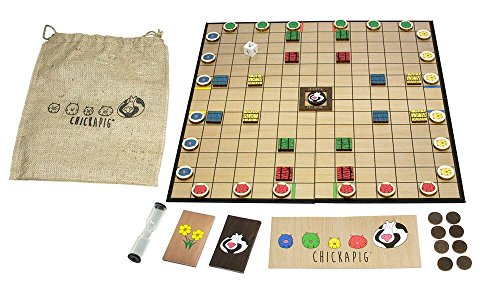 -. Feature : An exciting, fun-filled strategic board game where chicken-pig hybrids attempt to reach their goals while dodging opponents, hay bales, and an ever-menacing pooping cow. / Family friendly game for 2 or 4 players. Works great with teams or as a party game. Takes 30 - 60 mins to play / Easy to learn but serious chess-like strategy with just enough luck to keep everyone competitive. / Tons of replay value / Made in America, even the dice. Over 50 wooden pieces with an organic, down-on-the-farm feel!