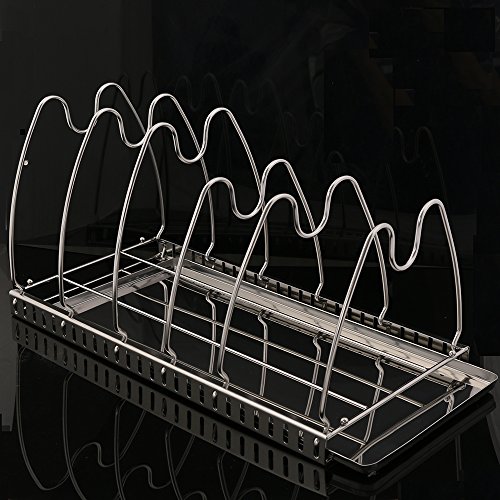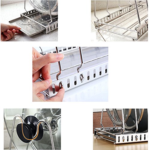 Studio : okdeals Publisher : okdeals Product Description Specification: Material: 304 stainless steel Size: 44.5 x 24x 24cm/17.5"x 9.4"x 9.4" Suitability: for pans, pot lids and cutting board Assembly required Package detail: 1 x Kitchenware Drying Rack 1 x manual instruction Design: adjustable pan pot rack have removable drained water holder, for deterring and draining water, dish rack and keep kitchen countertop dry. U-shaped frame which can tightly secure your cookware in place Space-saving:adjustable pan pot rack can offer you a clean and neat tool for pan pots organise in kitchen Drying Rack is constructed out of stainless steel to ensure durability, rust resistance, and simple cleaning. Two sizes of frames allow for capacity of different sizes of pans, lids, and cutting boards at once. Six frames to hold multiple items simultaneously. Frames are 1.1cm apart from each other. Removable platform holds drained water for easy drying of kitchenware to prevent the breeding of bacteria.